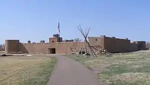 Three interesting sites are near the town of Larned southwest of Great Bend. A Trail visitor center west of town (1349 K-156 Hwy, ☏ +1 620 285-2054) contains a regional-class museum with some outside exhibits; open daily 9AM-5PM (closed Mondays during the off season, and also on major holidays), $4 for adults, $2.50 for students, $1.50 for children 6-11. About 4 miles beyond this site on K-156 is Fort Larned National Historic Site, a unit of the national park system that preserves a major military outpost along the Trail. Fort Larned is not one of the earlier Trail sites, dating only to 1860 when it was established to protect the increasing flow of Trail commerce from Indian raids, but it's particularly well preserved, with some original buildings, and well worth an hour or two; open daily 8:30AM-4:30PM. Finally, although authentic Trail ruts are hard to find in this agricultural area, a short, well-preserved set of ruts is southwest of Fort Larned on "190th Street," really a country road amid the farms. The exceptionally friendly and helpful rangers at Fort Larned can give you a map to this site, which has a short trail (through a prairie-dog town) to a viewing platform from which the ruts can be seen; go late in the daytime for best viewing, as shadows help bring definition to the ruts.