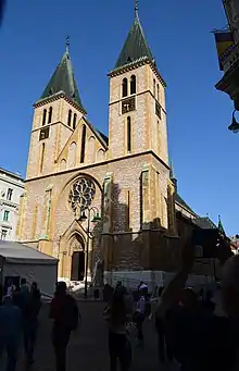 1 2 3 5 Katedrala), ☏ +387 33 210 281, toll-free: +387 33 225 591, mestar47@bih.net.ba. Tu-Su 09:00-17:30. The largest Christian cathedral in Bosnia, and the seat of Archbishop of Vrhbosna. It was built in honour of the Sacred Heart of Jesus in a neo-gothic style with Romanesque Revival elements, and modelled on the Notre-Dame of Dijon. Construction of the cathedral began on 25 August 1884, under Austro-Hungarian reign, was carried out by the Viennese contractor Baron Karl Schwarz, and supervised by architect Josip Vancaš. The cathedral was the scene of peace demonstrations in 1991 before the Bosnian War broke out, and subsequently damaged during the Siege of Sarajevo. The design above the door to the entrance is part of the flag and seal of the Sarajevo administrative canton and the Romanesque towers are featured on the flag and coat of arms of Sarajevo, making the building a symbol of the city. The niche above the portal features an octagonal rosette and a statue of the Sacred Heart. The interior of the cathedral was designed by architect Josip Vancaš, including the main altar which is made from Grisignano marble and rests on four columns of red Tyrolean marble. The frescoes were commissioned to Alexander Maximilian Seitz in 1886 but due to deteriorating health, they were only completed in 1887, and he died a year afterwards. Most of the actual work was undertaken by his assistant Alberto Rohden. A prominent feature is the grave of archbishop Stadler, the first archbishop of Vrhbosna, and the sculpture is of the hand of Marin Studin. The stained-glass windows ornamenting the cathedral were manufactured by the Viennese workshop of the Tiroler Glasmalerei (German for glass painting artisan). An English language mass is held on Sundays at 12:00. For candles, ask the information desk at the entrance (1 KM each). Photography not allowed. Free.