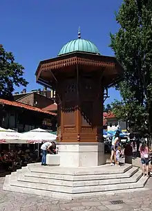 1 2 3 5 Baščaršija, Pigeon Square). 24/7. Pseudo-Ottoman wooden fountain in the middle of an open square in the old town of Sarajevo. It was built by Mehmed Pasha Kukavica in 1753, and under Austro-Hungarian rule moved to its current location in 1891 by Austrian architect Alexander Wittek. Three replicas of the fountain exist, respectively in Belgrade and Novi Pazar in Serbia, and in St. Louis in the US. The fountain offers shadow and drinkable water. The surrounded Pigeon Square got its name from the countless pigeons swarming around. Feeding pigeons is allowed, and a seller with a trolley sells corn to tourists to feed the birds. Free.