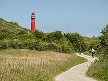 - 🌍 Noordertoren, Vuurtorenpad 28 (In the dunes between pole 3 and Vuurtorenpad/Boszicht 1 ). Counterpart of the aforementioned Zuidertoren. Where it is all white, the Noordertoren is completely red. The 37 metres (121 ft) tall lighthouse is, unlike its counterpart, still operated. Its dome has been replaced in 1979, equipping it with a radar antenna as well. Like the Zuidertoren, the lighthouse is a national monument, though unlike it, only the Noordertoren's stonework is registered as a monument.