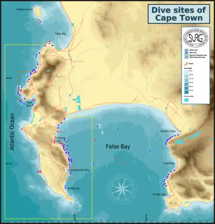 Technically the whole region is in the Atlantic Ocean – the official boundary with the Indian Ocean is at Cape Agulhas – but the ecological boundary between west and south coast is at Cape Point, and both local divers and marine biologists recognise a significant difference between the "Atlantic side" and False Bay.