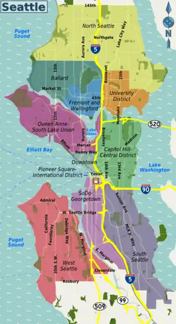 Seattleites usually divide the town by districts roughly divided as listed below. Although there are formally 30 neighborhoods and their boundaries are not always clear, there's usually a proud feature that represents each neighborhood.: