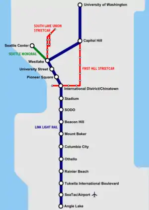 The reliable Link 1 Line light rail (see Β§ Get around) connects Northgate, the University of Washington, Capitol Hill, the downtown area, and South Seattle to Sea-Tac. Bus route 560 provides direct service from Sea-Tac to West Seattle.