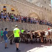 At 12:00 each day a dozen bulls are collected from the nearby hamlet of Peñalba and driven across the river and along C/ Argén to the Torre del Verdugo (Torre del Botxí), which they reach at about 13:00. The roads are lined with spectators, and a few daredevils will attempt to run with the bulls as they pass; there are several good perches along the city walls from which to observe the action.