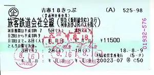The Seishun 18 Ticket (青春18きっぷ Seishun jūhachi kippu) is a discount rail ticket offered by Japan's JR network. When available (three times a year), it is easily the cheapest way to get around Japan, costing only ¥12,050 for five days of unlimited travel.
