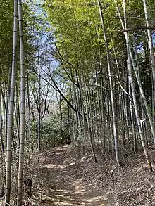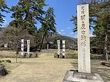 The Gifu Sekigahara Battlefield Memorial Museum (right) and the attached Café (left). The Mon on the tower are of the Ishida (left) and Tokugawa (right) clans. - 🌍 Ōtani Yoshitsugu's Grave (大谷吉継の墓 Ōtaniyoshitsugu no haka). One of the westernmost memorial markers in the town, this spot marks both the encampment and final burial site of Ōtani Yoshitsugu, one of the Western Alliance's main commanders. When he realized the defections of Kobayakawa Hideaki and others and the increasingly small likelihood of Western victory, he committed seppuku, or ritual suicide. Best reached by bicycle (although it is within walking distance, it just takes longer to get to than most other sites), but the final stretch up the mountain must be walked.