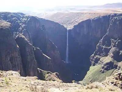 - The Maletsunyane Falls - 1 hour pony ride (or a longer walk) from the Semonkong Lodge, the highest single drop waterfall in Southern Africa at 192m. Above the waterfall, the Maletsunyane River in itself is nothing spectacular, which makes the discovery of the falls even more amazing! The scramble down the sides of the gorge is hard, but fairly safe and the noise and spray at the bottom by the pool is awe inspiring! Because no sun shines on the bottom, there is often snow down there, even in summer!