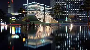 • ๐ŸŒ Namdaemun Gate (๋‚จ๋Œ€๋ฌธ, ๅ—ๅคง้–€) (Metro Line 1, City Hall station). The Great South Gate is an iconic symbol of Seoul and has been designated as National Treasure Number 1. Particularly beautiful when floodlit at night, and best combined with a visit to the adjacent Namdaemun Market. Much of the structure was destroyed by arson in 2008, although a faithful reconstruction was completed in 2013. Formally known as 'Sungnyemun' (์ˆญ๋ก€๋ฌธ, ๅด‡็ฆฎ้–€). The other city gates can be found in the neighboring Jongno district.
