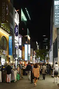 • ๐ŸŒ Myeong-dong. Probably the best-known shopping area. It is definitely the most tourist-friendly fashion area. In spring and summer, fashion models/sidewalk promoters can be seen strolling the streets of Myeongdong promoting various cosmetics, stores or other fashion-related products. Many regular people also tend to catwalk their newest outfit on these streets. Rows of stores are available to look for that perfect accessory, and most of Korea's major brands can be found here: mVIO, Caspi Conus, WhoAU California, AHM, So.Basic, Noxon, Basic House, UGIZ, 1492, nipper, hang ten, A6, Bean Pole, Jambangee, Giordano as well as a few international brands such as Lacoste, Land Rover, Adidas, Gap, Zara, Koolhaas, Uniqlo, Anna Sui, and Forever 21. Nearby are the Lotte and Shinsegae department stores. Excellent street food carts are all around from around 5pm.