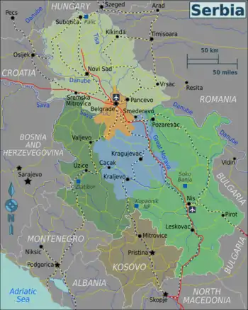 The land border can be crossed to Croatia, Hungary, Romania, Bulgaria, North Macedonia, Kosovo, Montenegro and Bosnia and Herzegovina.