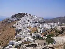 The main port of Livadhi has most accommodation and other services and is where most visitors stay. Hora, (sometimes called Pano Hora,) the old island capital, is the other settlement of note. Smaller villages are scattered around the rest of the island.