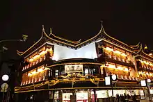 - City God Temple (Lao Cheng Huang Miao). The area around the Old City God Temple and the Yuyuan Gardens has become a large commercial hub, with many restored historical buildings as well as new buildings in a somewhat traditional style. Take photos, shop for souvenirs, and enjoy the many restaurants and eateries. Enjoy an illuminated diorama or other forms of 19th century street side entertainment. Come after 6:30PM when the lights show off the beauty of the buildings in a new way. Eat upstairs at one of the restaurants overlooking the square on Yu Yuan Lu (with a pond criss-crossed by a zigzag bridge and tea room) and see the reflections of the lights. (The City God Temple lies at the southern end of this commercial area, and the Yuyuan Garden at the northern end: the entrance to the Garden is near the zigzag bridge).