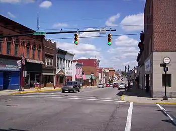 A view of downtown Shelby, Ohio on East Main Street looking east at the intersection of Gamble Street.