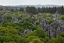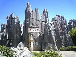 Shilin (石林, Shílín) karst region, the "Stone Forest", is a national park in Kunming Prefecture, Yunnan province in southern China. The huge pillars of stone, formed by erosion, look like something out of a fantasy film. The park is large, too big to see all of it in one day. It has several different areas and many interesting nooks and crannies, and you can easily lose yourself on the winding paths between the huge rocks.