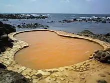 - 🌍 Furofushi hot spring (不老不死温泉). 08:00-15:30. At the base of the mountains, but outside the protected zone, this hot spring has muddy baths just beside the sea. One mixed bath and one female-only bath. Indoor baths also available. ¥600.