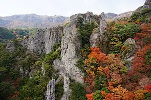 - Kankakei Gorge (寒霞渓) (buses operate every 1-2 hours between Kusakabe Port and the gorge (15 minutes, ¥300)). Considered to be one of the most beautiful gorges in Japan. As much as 812 m deep. Celebrated for its maple trees. The gorge can be traversed by cable car (¥750 one way, ¥1,350 return) or by a steep hike.