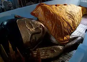 - 🌍 Wat Preah Prom Rath, Pokambor Ave. The glittering modern temple grounds give few hints as to its 500-year history. Though the lotus-themed architecture seems to emulate temples from over the border, the front gate integrates Bayon-style heads and a scene in relief of the Buddha seated under a tree, while armies fire arrows on one side and others are eaten by crocodiles on the other side, that looks like it could have been taken directly from Angkorian mural. Legend is that the site was established around 1500 when a famous monk landed ashore on a piece of his sinking boat. The boat wood was carved into the oddly foreshortened reclining Buddha installed in a swimming pool-like pit behind the imposing, yet despondent looking, seated Buddha in the main hall. Perhaps mimicking the construction materials origins, the reclining Buddha has taken on a sunken slant at the feet end. A pair of small weather worn cannons on either side of the hall are of unknown origin but their style, an embossed crown-like seal and mysterious numbers suggest a European origin.