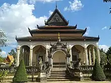 - 🌍 Wat Bo, Samdech Tep Vong St and St 22 (east side of the river; follow the road that continues from over Wat Bo Bridge). As one of the oldest temples it makes a nice contrast between the oldest and the glittering new ones, though the rough artwork wouldn't match the craftsmen of Angkor. The architecture of the ramshackle open air hall next to the main building blends French-style arches and balustrades with Thai-influenced Buddhist details. A forest of chedi surround the main hall, in between frangipani trees and some fine topiary.