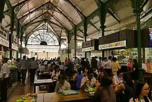 - π Lau Pa Sat, 18 Raffles Quay (near Raffles Place MRT). Open 24 hours. A nicely done up Victorian-style hawker centre, but a little pricier and hence quieter than most. Quiet during the day, every evening at 7 PM a section of Boon Tat St on the south side is closed to traffic and a long row of very popular satay stalls opens, with seating right on the pavement. Fatman Satay (Stall #1) generally gets the best reviews, but there are plenty of other good eats to be found.