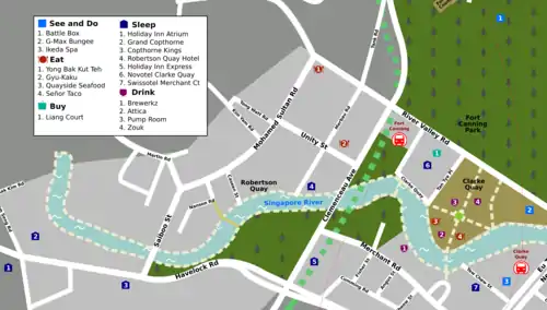 Singapore's nightlife is almost entirely concentrated near the river. The main party zones are Boat Quay, on the south of the river next to the financial district (MRT Raffles Place, exit G) and Clarke Quay on the north bank a few blocks inland (MRT Clarke Quay or Fort Canning). Less well known but also worth a look are Circular Road, parallel to Boat Quay just behind it, and Robertson Quay, an up-and-coming nightlife/restaurant zone at the western end of the river. Bars and pubs come and go with dizzying speed, so just head out and find today's hip spot. All four are within crawling distance of each other. Mohamed Sultan Rd, inland from Robertson Quay, used to be the place to be, but was severely eclipsed in the early 2000s by newer upstarts and most bars have been replaced by restaurants and furniture stores.