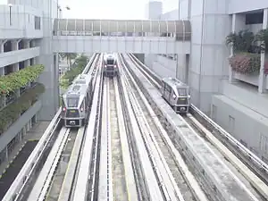 Changi Airport is the terminus of the East-West line of the Mass Rapid Transit (MRT) rail system. While cheap, the MRT is aimed squarely at commuters: there are no express services, the trains are regular commuter trains without baggage storage (although many of the train sets have handrails installed in place of seats in order to occupy more standing passengers with luggage), and can get quite crowded during rush hour (mornings towards the city, evenings towards the airport). But if you're not in a rush, don't have too much luggage or are staying near a station, the train can still be worthwhile.