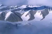 The Byam Martin Mountains extend from east to west across Bylot Island and are an extension of the Baffin Mountains which in turn form part of the Arctic Cordillera mountain system. The highest mountain in the range is Angilaaq Mountain, 1,951 m (6,401 ft), near the island's centre. The Byam Martin Mountains are made up of Archean-Aphebian igneous crystalline rock and Proterozoic metasedimentary and metamorphic rock, such as gneiss. Sharp peaks and ridges, divided by deep glacier-filled valleys are typical features in the range and has been extensively modified by glacial erosion. Extensive glaciers dot the island including the Kaparoqtalik Glacier. Vertical cliffs along the coastline are made up of Precambrian dolomite. The island's north shore faces Lancaster Sound, a polar bear maternity den area, also noted for its high concentrations of marine wildlife. To the northeast of the park is Baffin Bay and to the south lies Pond Inlet and Eclipse Sound.