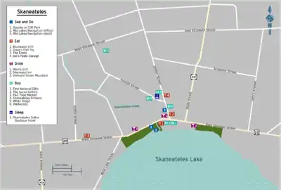 - Skaneateles Suites, ☏ +1 315 685-7568. Has a free program called "Secret Places." Just stop by and see them for a kind of customized walking / driving tour of out of the way places. Much fun.