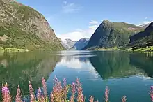 Virtually all road transport in the area runs through Skei because Jostedalsbreen is a major barrier to the east and the north-south road transport is difficult along the extremely fragmented coast to the west. Skei sits at the upper end of the lake and is the main settlement. Vassenden village sits at the lower end of the lake - "Vassenden" literally means "End of Lake".