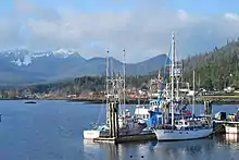 Daajing Giids and Skidegate are neighbouring villages located 9 km (6 mi) apart. Daajing Giids offers several motels, shops, restaurants, a gas station and auto repair, a credit union, RCMP station and a hospital. With its small harbour, Daajing Giids is often the starting point for chartered tours into Gwaii Haanas National Park Reserve and Haida Heritage Site on southern Moresby Island. Skidegate Landing, the easternmost neighbourhood of Daajing Giids, includes the BC Ferries terminal serving the ferry route between Haida Gwaii and Prince Rupert (on mainland British Columbia), and the ferry route between Graham and Moresby Islands.