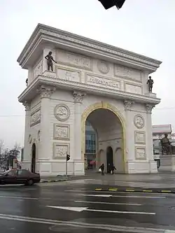 - 🌍 Porta Macedonia (Порта Македонија), ☏ +389 02 3151 141, PortaMK@mmb.org.mk. A triumphal arch built in 2011 to commemorate 20 years of Macedonian independence. The 21 m (69 ft) arch contains marble reliefs on its exterior depicting various scenes from Macedonian history. It has interior rooms as well as an elevator to the observation deck. Access to the deck is included in the ticket price at the Museum of the Macedonian Struggle.