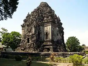- π Candi Sari (Sari Temple) (600 m to the northeast of Candi Kalasan). Built as the dormitory for a Buddhist monastery. There are two floors with three rooms on each. The reliefs are similar to those at Candi Kalasan and the walls are also covered with bajralepa. There are Boddhisatvas and Dewi Tara carved beside the windows indicating the link between Candi Kalasan and Candi Sari. The roof consists of 9 stupas in a grid formation. The holes in the construction show how timbers were used as part of the building process. This candi is considered to have been built in the same era as Candi Kalasan.