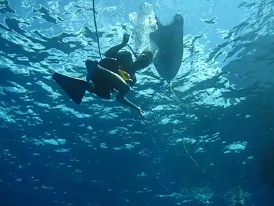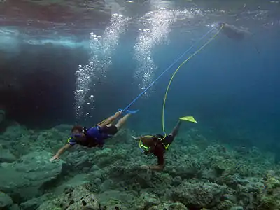 - The participant tows the raft on the surface via a lightweight harness connected to the air line. This gives the customer the secure knowledge that he/she cannot descend too deep and allows them to choose the depth that they feel most comfortable with while being able to control their depth, descent and ascent rates. By using the hose as a guide and wearing weights to achieve neutral buoyancy, participants are able to descend anywhere from just under the surface to 6 metres (20 ft) deep.