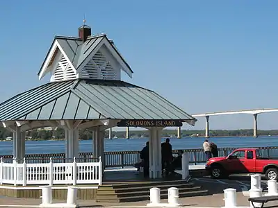 Solomons (Solomons Island) is a resort area in Southern Maryland, near the Patuxent Naval Air Station. Solomons within a two-hour drive of Washington, D.C., Baltimore, and Annapolis. Solomons is also close to the Calvert Cliffs State Park, which is fun for fossil hunting. Located where the Patuxent River meets the Chesapeake Bay, it is a popular destination for fishing and boating. Solomons also has a nice, short boardwalk at the tip of the peninsula and a lively restaurant scene.
