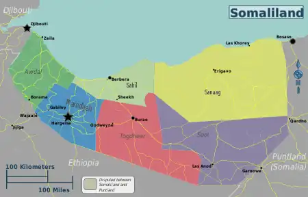 The legitimacy of the Somaliland government is not recognised by any UN member state, and all other governments consider it legally part of Somalia. However, from a traveller's point of view, the Somaliland government has control of the area (separate visas, laws, currency, etc). This is not a political endorsement of claims by either side in the dispute. |