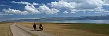 It is the second largest lake in Kyrgyzstan (18x29 km wide, 13 m deep) after Issyk kul. Its name, meaning "following lake", is popularly considered to refer to this relation. It is surrounded by a broad summer pasture and then mountains. The area is inhabited and safely accessible only from June to September.