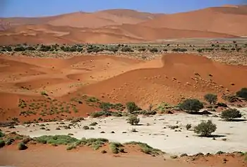 Sossusvlei is a mud pan created by the Tsauchab River that flows through the Namib every 5 to 10 years. Even in very wet years it does not reach the Atlantic Ocean but gets blocked by sand dunes, and then slowly evaporates. The clay that the Tsauchab deposits has created Sossusvlei and, centuries ago with a different river course, the Dead Vlei. Sossus means "place of no return" (note: there are other explanations, this is the one given by local guides), and a vlei is Afrikaans for 'clay pan'.