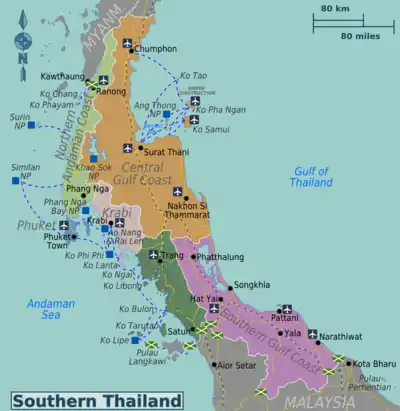 | Southern Gulf Coast Beautiful beaches and nature, popular among Malaysian travellers. Due to separatist struggles, the three deep southern provinces might be better avoided. |