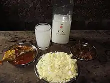 Kheer, also called payasam or payesh, is South Asian rice pudding. The default version contains rice, sugar and thickened milk as a minimum and is usually flavoured and garnished with cardamom, saffron, raisins, nuts, petals and/or floral essences. It can be eaten cold at the end of a meal or hot at the start or end of a meal like porridge. Variants of the dish substitute the rice with other grains or pseudo-grains such as bulgur, sago and tapioca.