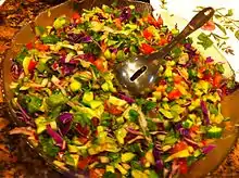 - Kachumber – this classic, everyday salad from Northern India contains the essential trio of chopped up cucumber, onions and tomatoes seasoned with salt, black pepper, cumin powder, red chilli powder. Green chillis and herbs like coriander and mint may be added. The dressing is either lemon or lime juice with no sugar or oil added. A similar salad from Afghanistan called Salata or Afghan salad usually has the same triad of vegetables with the addition of carrots and may contain other herbs such as parsley and dill.
