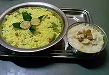 - Lemon rice or Chitranna – a South Indian dish, especially popular in Karnataka, made by seasoning rice with split chickpeas, black gram, peanuts, mustard seeds, turmeric and generous amounts of lemon juice, which gives it its characteristic tang. Other ingredients like cashews, green beans, chillies and onions are optional. It is eaten at any time of the day though breakfast is most common. It can be eaten by itself or be accompanied by a chutney or raita (yoghurt condiment).