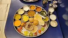 A thali includes a serving of rice, flatbread or both, dal, vegetables and an assortment of curries. This is usually accompanied by raita or yogurt, chutneys and pickles. Thalis may also include desserts which are served in different bowls or compartments. In restaurants, you can order thalis based on region (e.g. Punjabi or Bengali thali) or by type of food served (vegetarian, seafood, etc.).