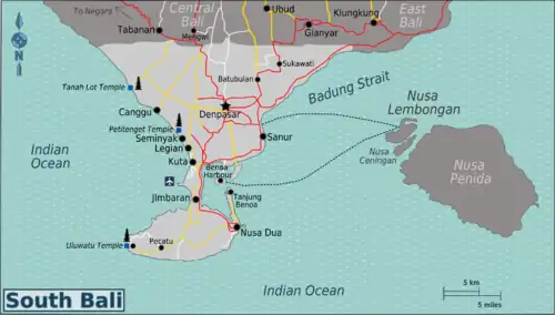 Most visitors to Bali will arrive at Ngurah Rai International Airport, also known as Denpasar International Airport, in the heart of the South Bali region. Despite the misleading name, the airport is actually located between Kuta and Jimbaran, roughly 30 minutes away from Denpasar. More information about the airport is in the main Bali article.