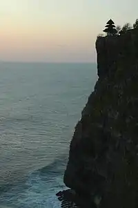 In the completely opposite direction at the southwestern most tip of the Bukit Peninsula sits Uluwatu Temple (Pura Uluwatu). The location of the temple is truly spectacular perched 75 metres up on a limestone cliff above crashing waves. There are more steep headlands on either side and sunsets over Uluwatu are a sight to behold. Though a small temple was claimed to have existed beforehand, the structure was significantly expanded by a Javanese sage, Empu Kuturan in the 11th century. Another sage from East Java, Dang Hyang Nirartha is credited for constructing the padmasana shrines and is claimed to have attained Moksha here. You are free to walk around the temple grounds but the central courts can only be entered during special rituals. The temple is inhabited by many monkeys, who are extremely adept at snatching visitors' belonging, including bags, cameras and eyeglasses. Keep a very close grip on all your belongings and stow away your eyeglasses if at all possible. If you do have something taken, the monkeys can usually be induced to exchange it for some fruit. Rewarding the monkeys like this only encourages them to steal more. Locals and even the temple priests will be happy to do the job for you.