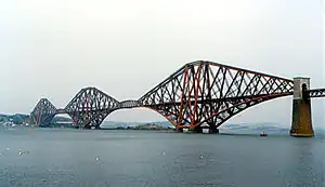- 🌍 Forth Bridge. This cantilever railway bridge, completed in 1890, carries the East Coast Mainline railway from London to Aberdeen. It's of very sturdy construction, as in 1879 the winter winds had tragically brought down the Tay rail bridge. That bridge's architect was sacked from the Forth project, and the design allowance for wind strength raised five-fold. Painting the Forth Bridge was long a by-word for a never-ending task, but in 2011 they finally finished, as modern paints were much longer lasting. In 2015 the bridge became a