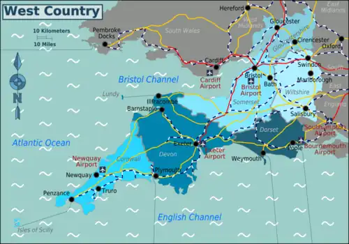 Bournemouth, Exeter and Newquay all have airports with services from elsewhere in the UK and abroad. Southampton Airport, in the neighbouring South East region, is very well placed for Dorset and Wiltshire.