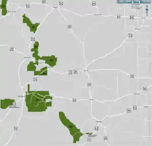 The boundary between this region and Southwest New Mexico is indistinct and open to debate, but for purposes of this article, is taken to be the western slopes of the Sacramento Mountains including (just barely) White Sands National Park. Otherwise, it is bounded on the east and south by the Texas state line, and on the north by Interstate highway 40, which follows the route of historic Route 66 in New Mexico.