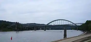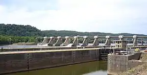 Pike Island, Yorkville, two locks and a gated dam, one of the two major types of dams in service. Controls the water level in the navigation pool upriver of the dam. Machinery moves large chains which lift gates that are hinged into the body of the piers. The gates are raised or lowered to control the amount of water flowing under them. The upstream pool is maintained at a relatively constant level for an authorized depth of at least 9 feet throughout its length. The dam cannot be operated to control flood flows.