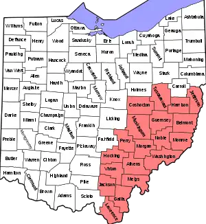 Athens County, Gallia County, Fairfield County, Hocking County, Jackson County, Lawrence County, Meigs County, Monroe County, Morgan County, Noble County, Perry County, Vinton County, Washington County, Belmont County, Coshocton County, Guernsey County, Harrison County, Jefferson County, Muskingum County, Tuscarawas County