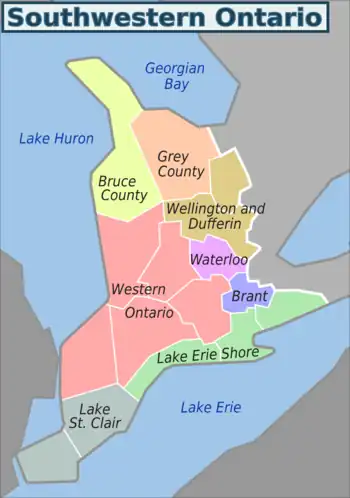 Southwestern Ontario is the geographic area of Ontario extending from the Bruce Peninsula and Lake Huron on the north, the Lake Huron shoreline on the west, the Lake Erie shoreline on the south, and neighbouring the Toronto-Hamilton-Niagara Golden Horseshoe region on the east. Its principal population centres are on the '401 corridor' cities - Windsor and Chatham-Kent, London and St Thomas, Woodstock and Ingersoll, Kitchener-Waterloo, Cambridge and Guelph, with Sarnia, the western terminus of Highway 402; Brantford, on Highway 403, and Stratford. Other significant centres are Collingwood and Owen Sound, Goderich, Tillsonburg and Simcoe.