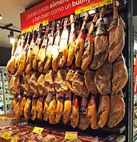 - Jamón (air dried ham): Jamón serrano (Serrano ham): obtained from the salt meat of the back legs of the pig and air dried. This same product is given the name of paletilla ("trowel") when it is obtained from the front legs. Other names to look out for are jamón ibérico (Iberian ham) and jamón de bellota (acorn-fed ham). There are famous jamones that are made in Huelva, in Guijuelo (Salamanca province), in the Pedroches (Cordova province) and in Trevélez (province of Granada). jamón ibérico is made from free range pigs. One well known chain in Spain is Mesón Cinco Jotas, which is known by locals for their expensive, but good quality ham.